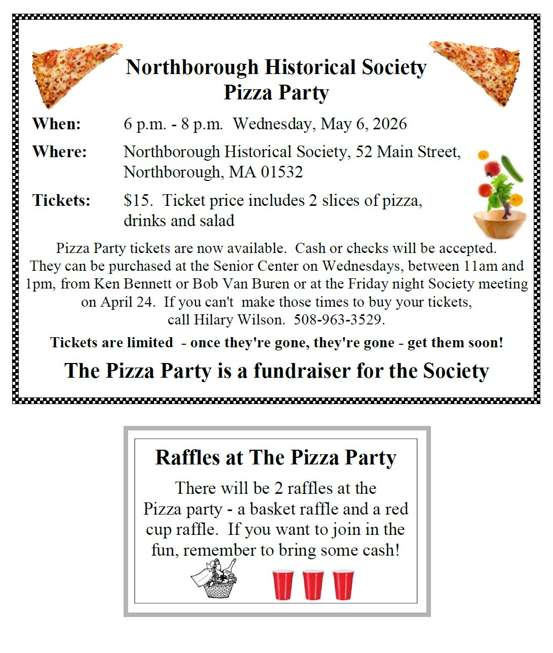The Northborough Historical Society will host a fund raising pizza party on Wednesday May 6, 2026 starting at 6 p.m. The event will also feature two raffles.
